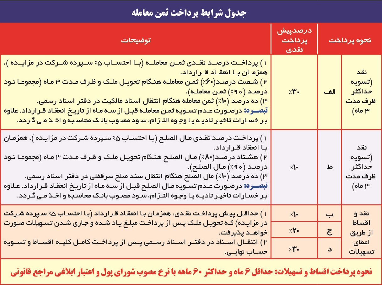 تذکر: کلیه اشخاص حقیقی و حقوقی در فروش های نقد و اقساط از طریق اعطای تسهیلات در صورتیکه واجد شرایط دریافت تسهیلات شناخته شوند مشمول دریافت تسهیلات می گردند. بدین لحاظ می بایست کلیه مدارک و مستندات مورد نیاز اعلامی جهت اعتبارسنجی بهمراه سایر مدارک مورد نیاز جهت شرکت در مزایده ارائه نمایند. چنانچه متقاضی حائز شرایط دریافت تسهیلات نباشد( ازجمله بدحسابی وسوء سابقه چک برگشتی و تسهیلات/تعهدات غیر جاری و ...) مزایده گزار در هر مرحله از مزایده مختار خواهد بود پیشنهاد شرکت کننده در مزایده را رد نماید.