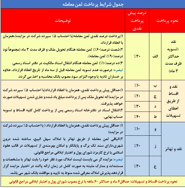 تذکر: کلیه اشخاص حقیقی و حقوقی در فروش های نقد و اقساط از طریق اعطای تسهیلات در صورتیکه واجد شرایط دریافت تسهیلات شناخته شوند مشمول دریافت تسهیلات می گردند. بدین لحاظ می بایست کلیه مدارک و مستندات مورد نیاز اعلامی جهت اعتبارسنجی بهمراه سایر مدارک مورد نیاز جهت شرکت در مزایده ارائه نمایند. چنانچه متقاضی حائز شرایط دریافت تسهیلات نباشد( ازجمله بدحسابی وسوء سابقه چک برگشتی و تسهیلات/تعهدات غیر جاری و ...) مزایده گزار در هر مرحله از مزایده مختار خواهد بود پیشنهاد شرکت کننده در مزایده را رد نماید.