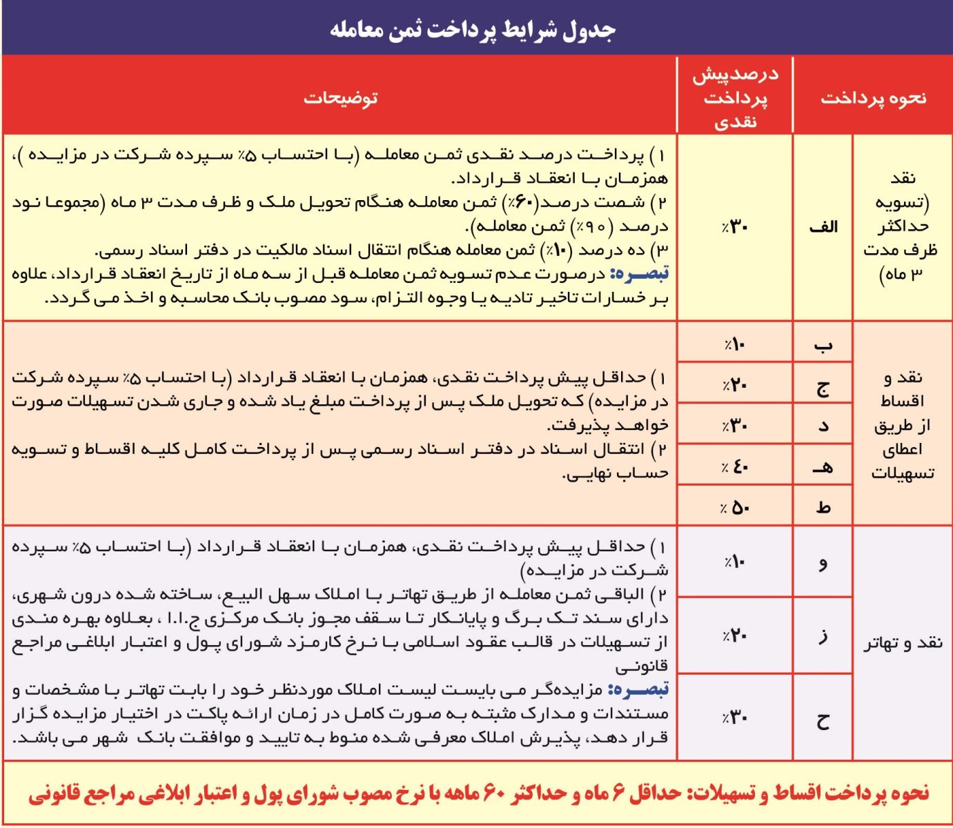 تذکر: کلیه اشخاص حقیقی و حقوقی در فروش های نقد و اقساط از طریق اعطای تسهیلات در صورتیکه واجد شرایط دریافت تسهیلات شناخته شوند مشمول دریافت تسهیلات می گردند. بدین لحاظ می بایست کلیه مدارک و مستندات مورد نیاز اعلامی جهت اعتبارسنجی بهمراه سایر مدارک مورد نیاز جهت شرکت در مزایده ارائه نمایند. چنانچه متقاضی حائز شرایط دریافت تسهیلات نباشد( ازجمله بدحسابی وسوء سابقه چک برگشتی و تسهیلات/تعهدات غیر جاری و ...) مزایده گزار در هر مرحله از مزایده مختار خواهد بود پیشنهاد شرکت کننده در مزایده را رد نماید.